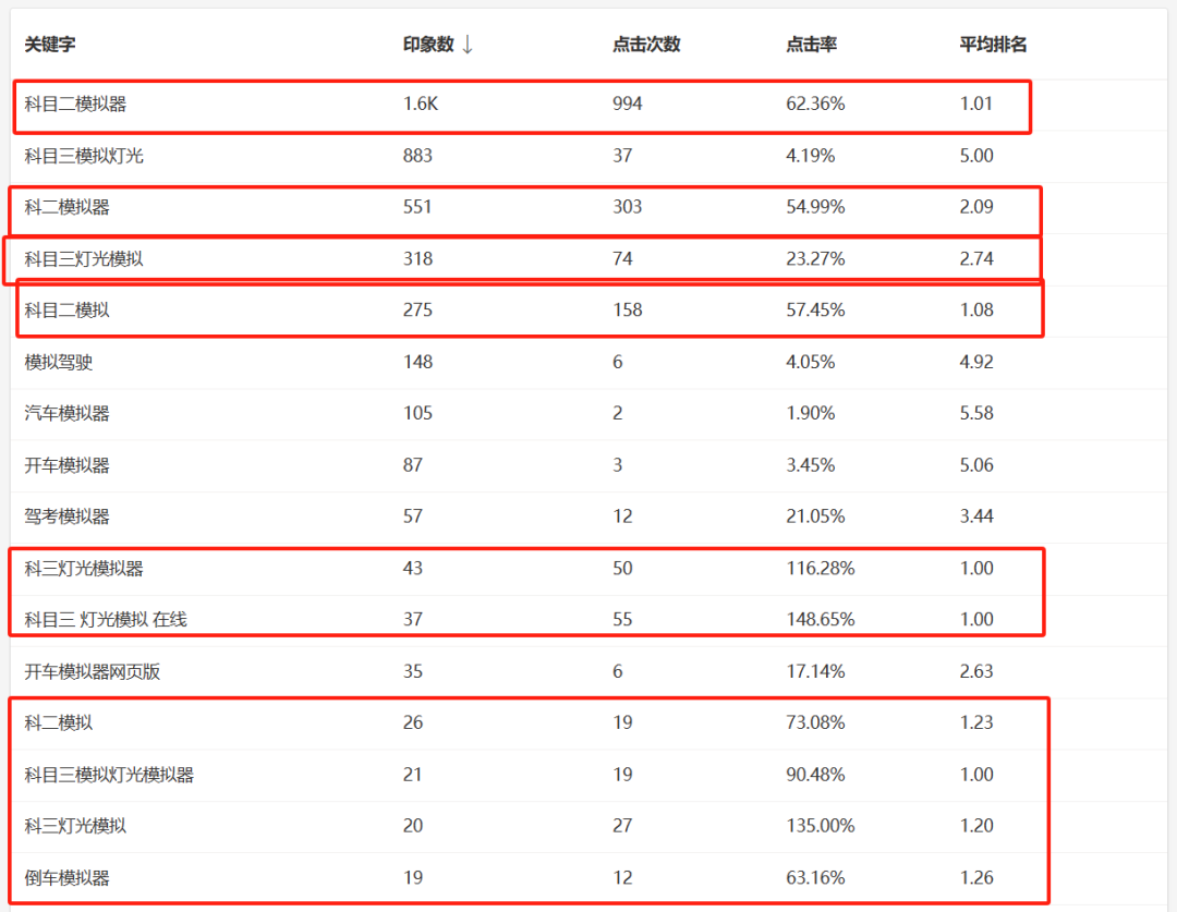 可以看出,基本上所有关于“科目二模拟”和“科目三灯光模拟”的关键词都被我“霸占”了,这些词的排名基本上都是数一数二。我感到开心的同时,也有一丝惭愧,毕竟我觉得我做的这两个程序还有不足,却长期霸占搜索榜第一,若不能给用户带来有效的帮助,有点“德不配位”的感觉,哈哈哈。