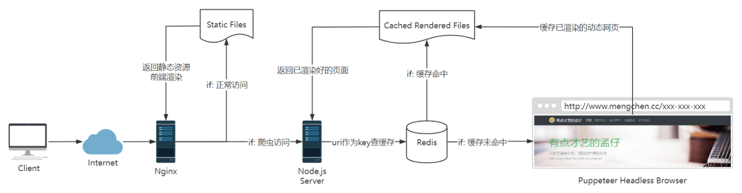 我最终采用的方式,是一种懒加载(lazy-load)的预渲染,我称之为“按需预渲染”。其大致流程是,在Nginx端针对普通请求与爬虫请求执行不同的操作,普通请求直接返回原始的静态文件并在前端动态渲染,而爬虫请求,则是被重定向到另一个模块,这个模块将会启动puppeteer去加载页面,并将渲染后的页面内容返回。整体大致流程图为: