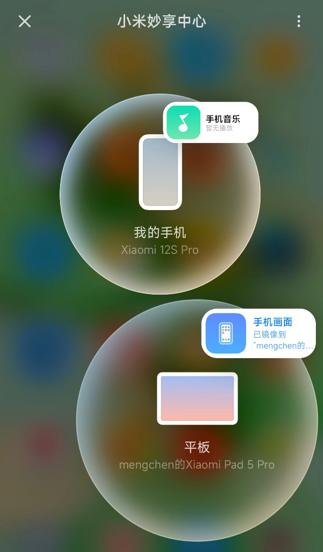 这里使用的小米妙享是MIUI的新功能,可以将应用或屏幕流转到其他设备上。下图是将手机界面同步到平板上