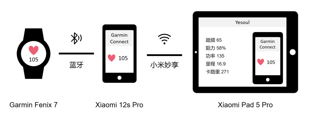 最终我想到了一个办法,就是利用Garmin App的实时心率+小米妙想的屏幕同步,在平板上实现心率的实时展示。大致结构图如下: