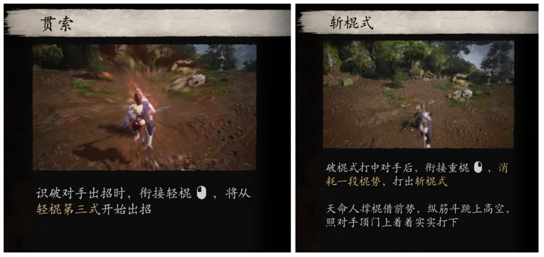 贯索:识破成功后,衔接轻棍,可以直接从第三段轻棍开始出招。由于大多数轻棍造成的伤害主要是通过轻棍三、四、五段来实现的,因此该技能可以在识破触发后快速补伤害并获得棍势,保持战斗节奏。需要注意的是,如果识破时的破棍式已经将对手击退较远距离,那么此时接轻棍可能会无法靠近对手从而打空。
