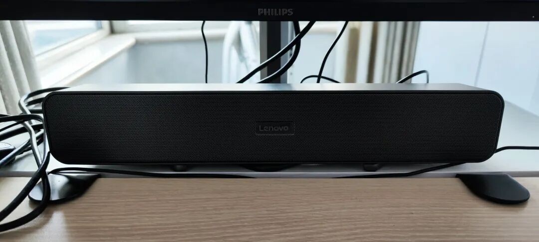 笔记本放在了桌子底下,那当然就没法用自带扬声器了,需要添置一个外置音箱。我对音箱没有特殊的要求,最终选了一款联想的长方体形状的音箱,放在显示器的牛角支架上方。两个logo正好上下排列,处于中央位置,看上去有一定的立体美感。