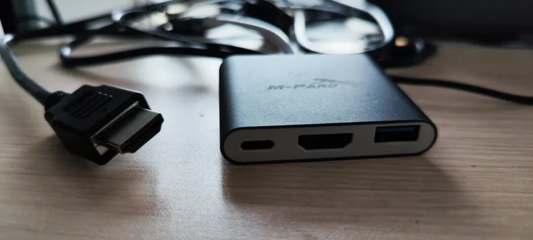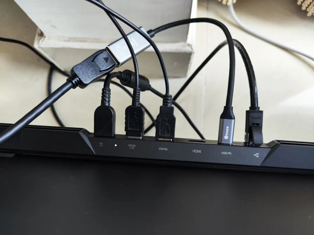 由于显示器使用了DP连接,那么HDMI似乎就浪费了。为了充分利用,我依然用HDMI线的一头连接到了显示器,另一头放在了桌面上。如果我要把Macbook放到桌面上投屏到显示器,那么只需将终端扩展坞拔下来,换个方向,将HDMI口插入扩展坞,然后将扩展坞的C口插入Macbook即可。这样能实现现有设备兼容两台电脑的使用。