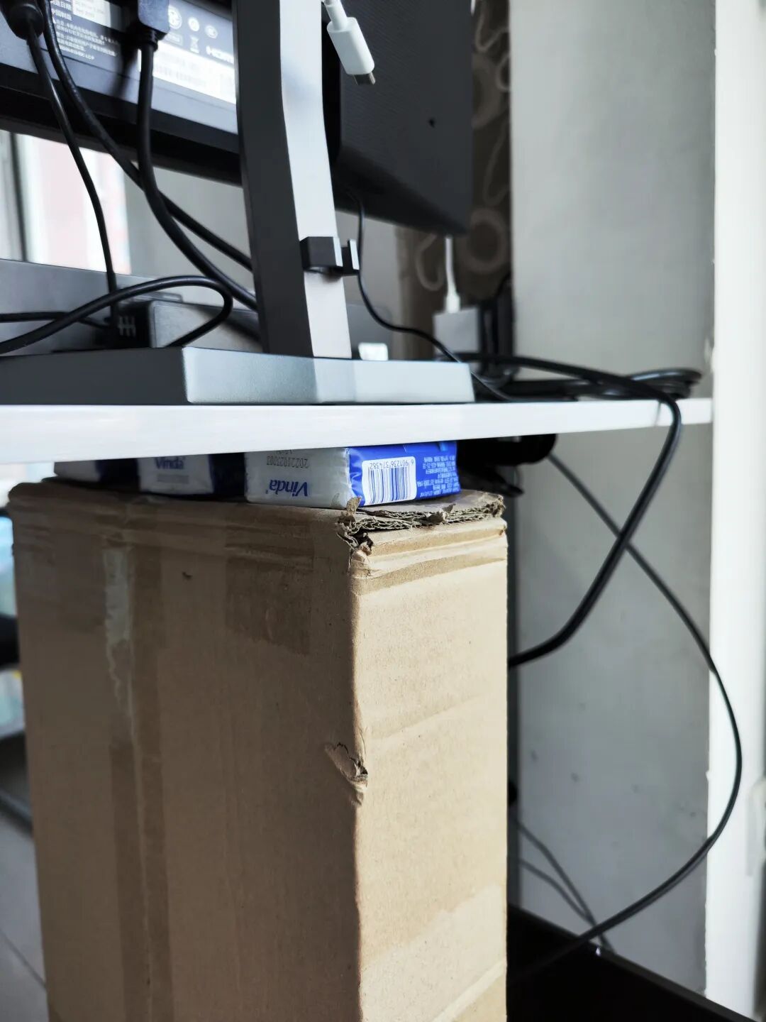 这个延长板长度为24cm左右,最大承重25kg,正好够放置一台5kg的显示器。由于这个延长板是免打孔安装,承重后会有一定角度的向后倾斜,虽然远远没有超过商品介绍的最大承重,但是总还是有些不放心,想用个什么东西在下方辅助支撑一下。于是我将延长板的包装纸箱竖起来,发现还差几厘米,于是用几包纸巾填补了空隙,这样就相当于加了一层保险,不用再提心吊胆了。