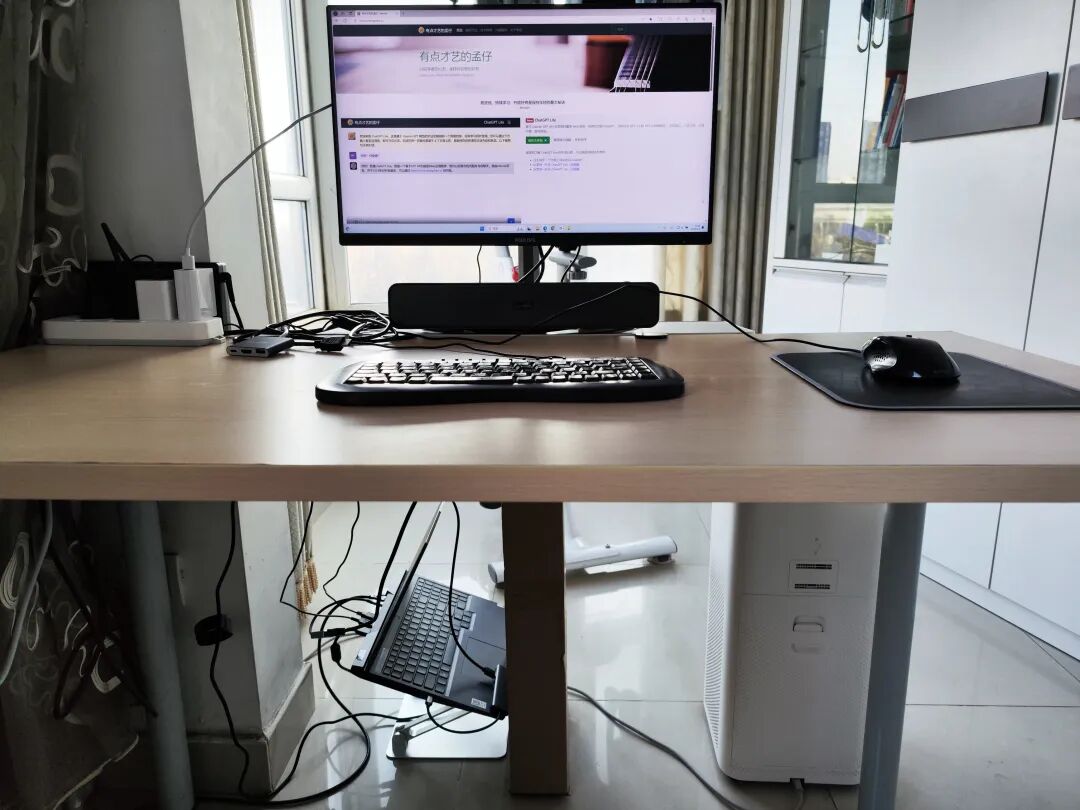 最终,我想到了,干脆就直接把电脑放在桌子下面,这样桌面空间就腾出来了,电脑离得远了,噪音也小多了,也就不会出现双耳听觉不平衡的问题了。