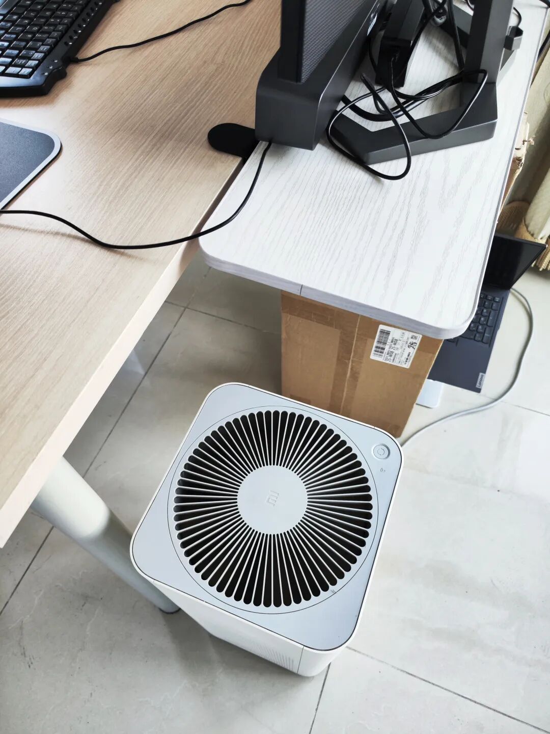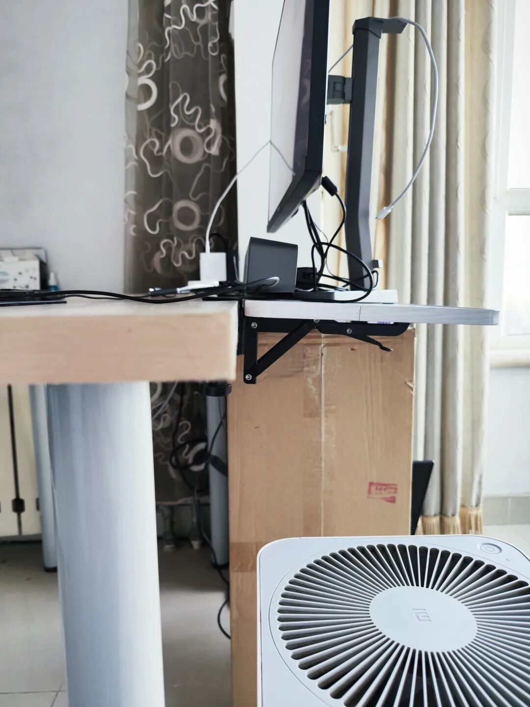 安装了延长板后,由于延长板宽度比桌面小,恰好这两条边围成了一个方形的区域,此时把空气净化器放在这个区域中,净化后的空气正好从这个区域上方吹出来,实现了空间的充分利用。