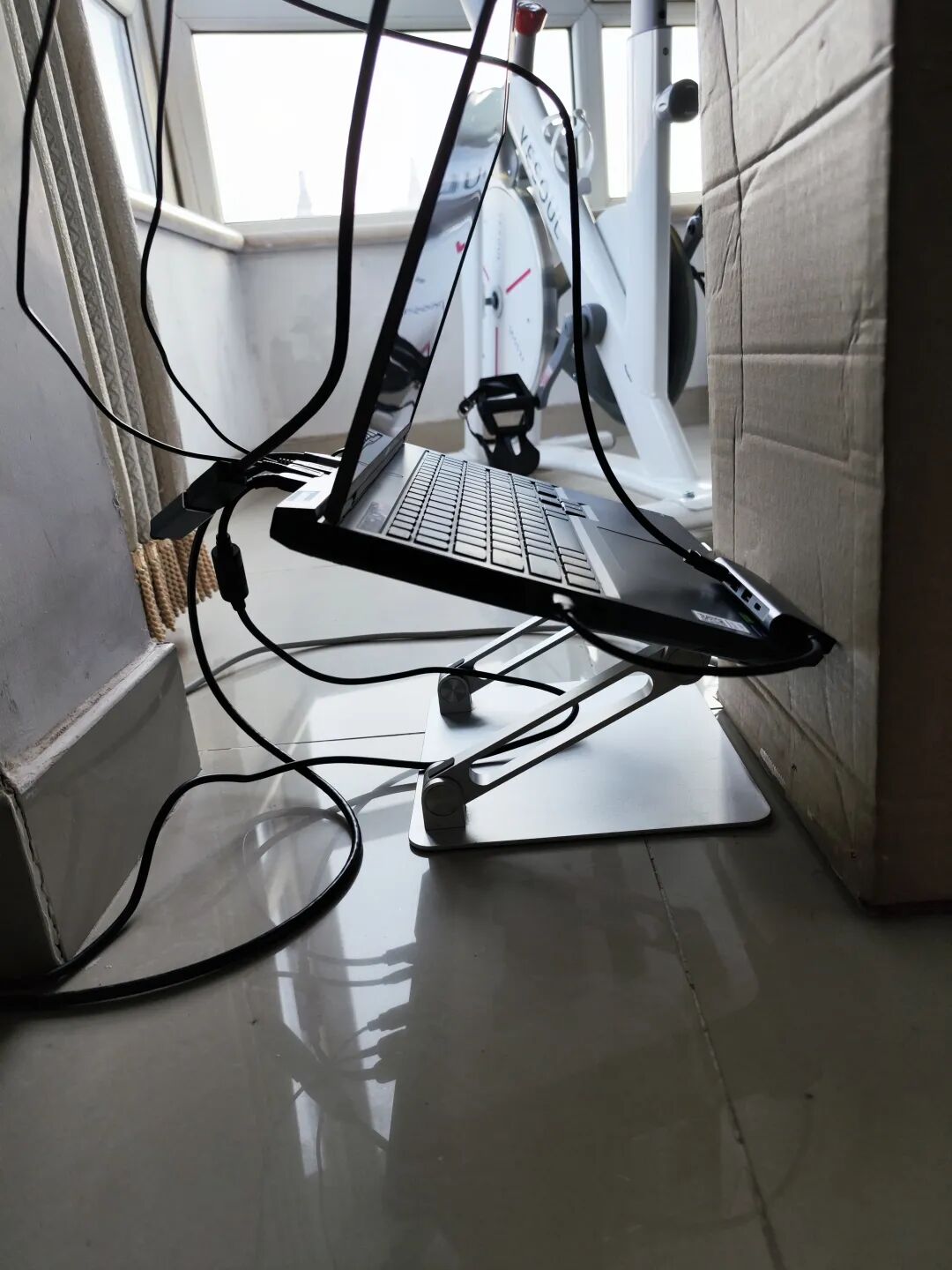 第一,最好用个稳固的支架支起来,既能增加笔记本的散热,也能防止万一地面上有水渗入电脑内的安全隐患。