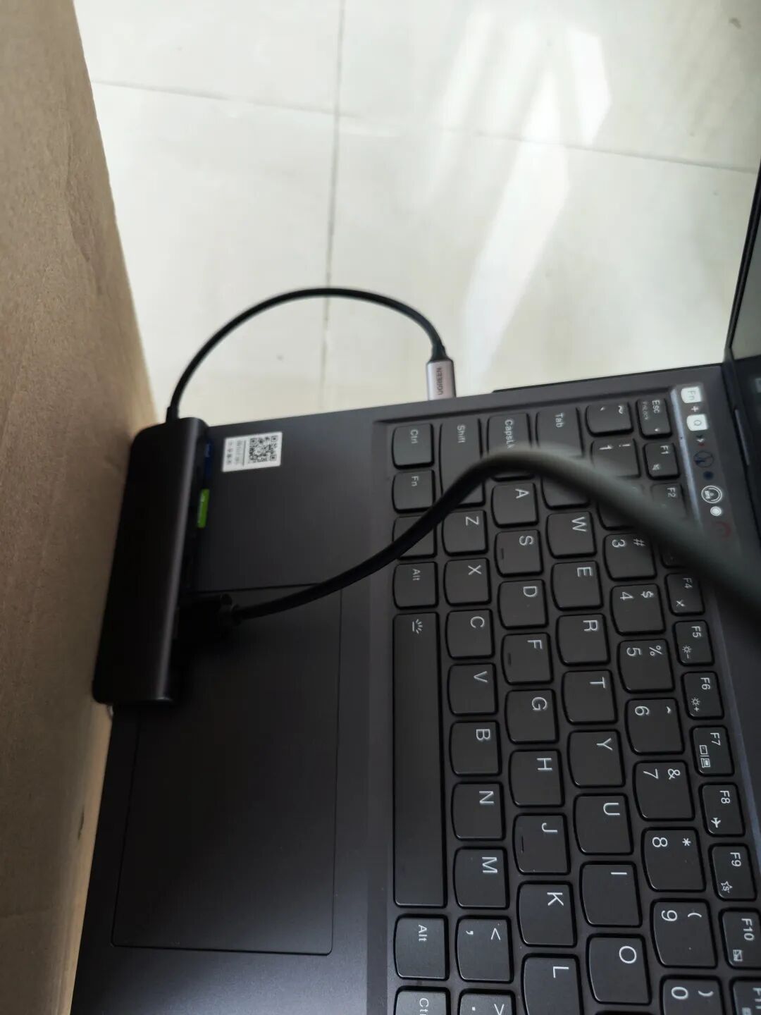 我之前有两个扩展坞,但是线长都很短,所以单独又买了一根USB-A to C母口的延长线,将两个扩展坞连接起来。起始扩展坞直接连接到笔记本的C口,由于线弯曲了,所以正好借助支撑桌面延长板的纸包装盒来挡一下,防止扩展坞掉落到地面。