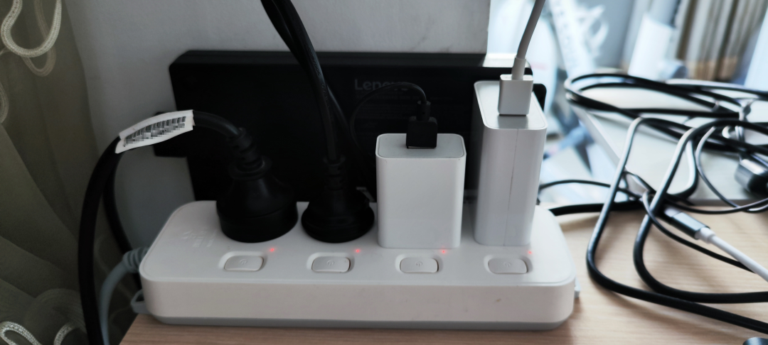 电源插排放在了桌子的左上角,从左到右依次为笔记本(300W)、显示器、音箱、手机(120W)充电器。插排后面的黑色板砖就是笔记本300W的适配器。插排的每个插口可由独立开关控制。手机充电线如果不想放到桌面上,可以搭到显示器后面的支架上。