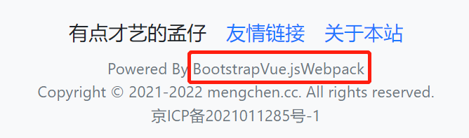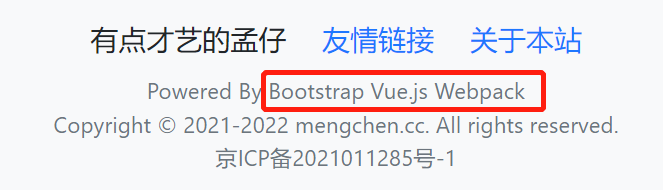 <div class="small text-muted">Powered By<a class="text-muted" href=" " target="_blank">Bootstrap</ a><a class="text-muted" href="https://cn.vuejs.org/" target="_blank">Vue.js</ a><a class="text-muted" href="https://webpack.js.org/" target="_blank">Webpack</ a><br>Copyright © 2021-2022 mengchen.cc. All rights reserved. <br><a class="text-muted" href="https://beian.miit.gov.cn" target="_blank">京ICP备2021011285号-1</ a></div>
