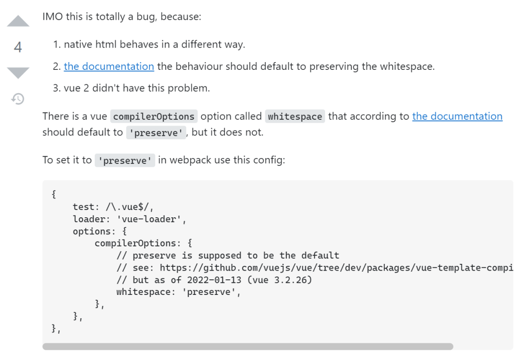 app.config.compilerOptions.whitespace = 'preserve'然而,It doesn't work. 接着又看到了这一段描述: